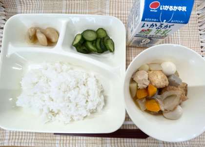 今日の献立は、ごはん・関東煮・きゅうりの梅風味・白花豆の煮もの・牛乳です。