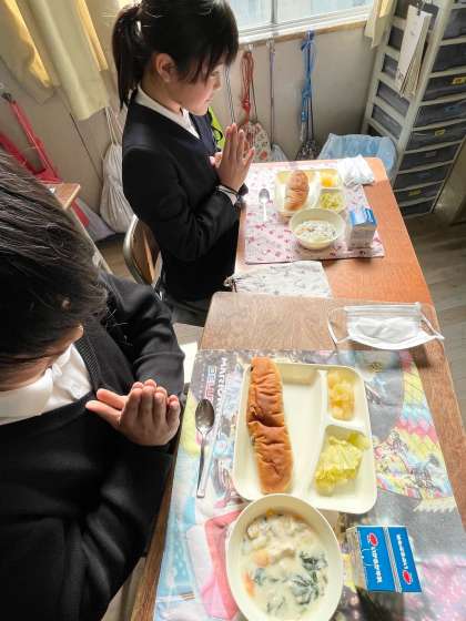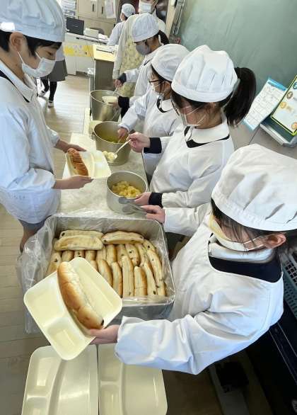 今日の献立は、レーズンパン・ほうれん草のクリームシチュー・キャベツのサラダ・洋なしの缶づめ・牛乳です。
