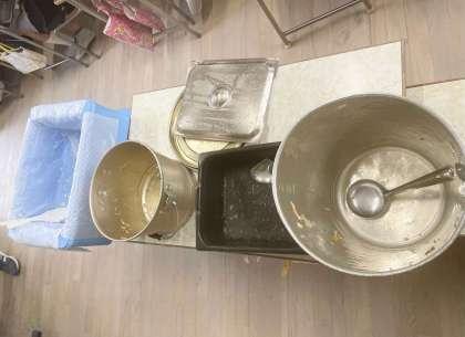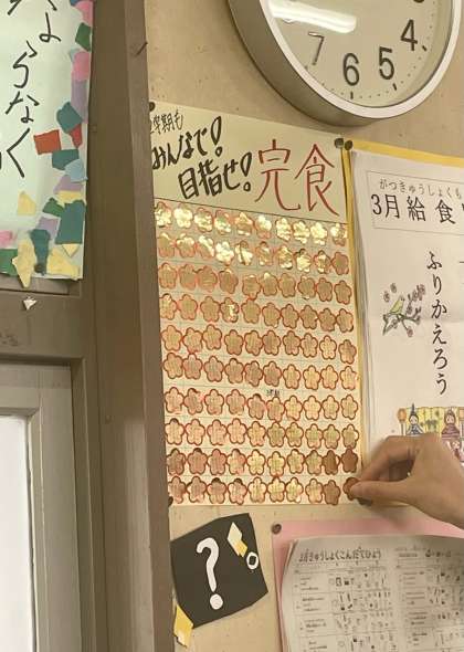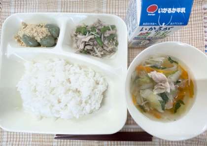 今日の献立は、ごはん・豚肉と野菜のいためもの・すまし汁・きな粉よもぎだんご・牛乳です。