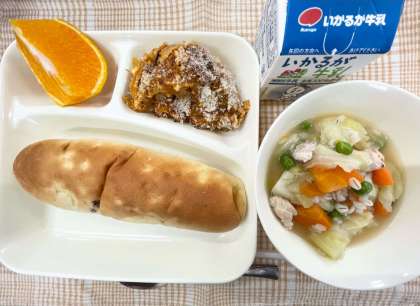 今日の献立は、おさつパン・とうふのミートグラタン・押麦と野菜のスープ煮・デコポン・牛乳です。