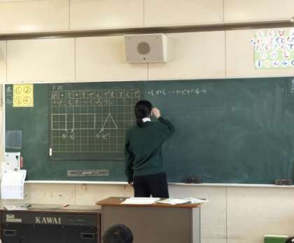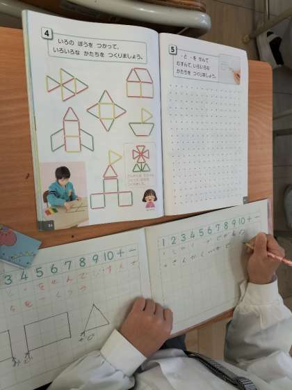 点と線で「かど」をつくっていろいろな形をつくります。いろいろ考えながら形を描いています。