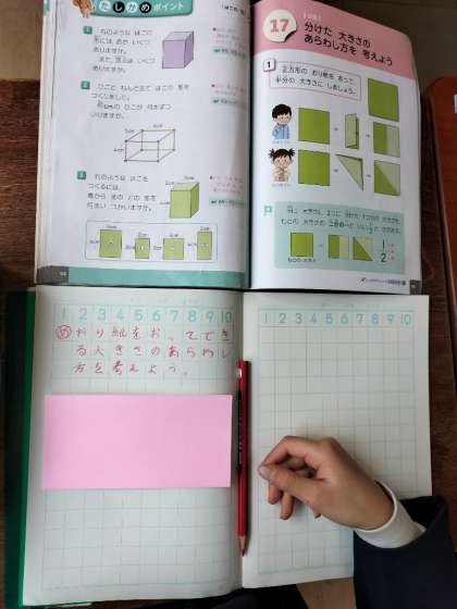折り紙を使う学習なので図形かなとも思いますが、実は分数の学習の始まりです。