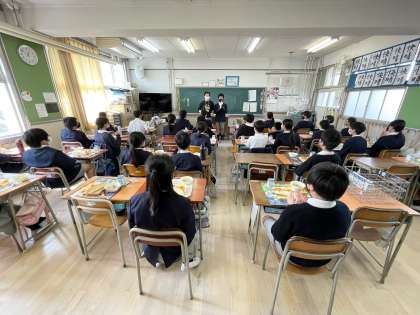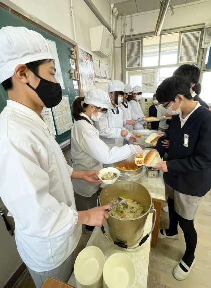 今日の献立は、コッペパン・ブルーベリージャム・えびのチリソースいため・中華がゆ・デコポン・牛乳です。