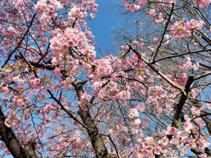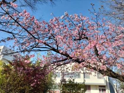 早咲きの桜でしょうか。6年生の卒業を祝うかのように咲き始めました。