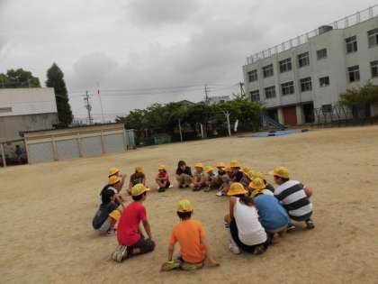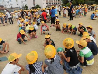 今日は2学期最初の児童集会があり、縦割り班で「ボールまわしゲーム」を楽しみました。音楽がなっている間、しりとりをしながらボールを送っていき、音楽が止まった時にボールを持っていた子がアウトです。アウトになったら円の真ん中に入ります。