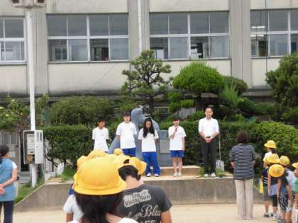初日の今日は、児童集会前に、「休み時間にいっぱい遊びましょう」と、子どもたちにあいさつをしました。4名とも本校の卒業生ですので、「あ!○○さんや!知ってる〜!!」などと、嬉しそうにしている子がたくさんいました。