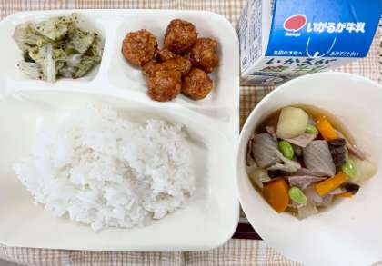 今日の献立は、ごはん・まぐろのオーロラ煮・豚肉と野菜の煮もの・キャベツの赤じそあえ・牛乳です。