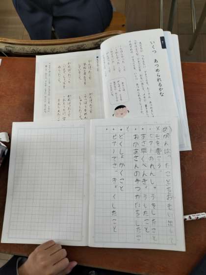 自分ががんばったことを友だちに伝えるためにメモにしています。たくさん思い出して、しっかりと書いています。
