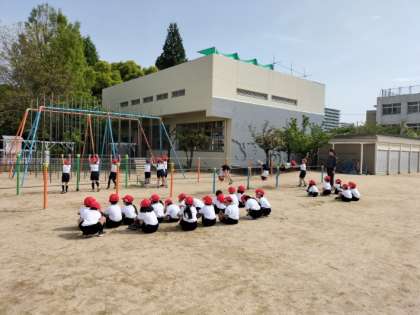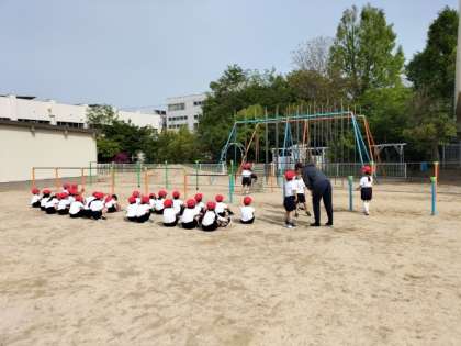 元気いっぱい、運動場での体育です。今日は鉄棒にチャレンジしました。先生の話をよく聞いて、順番も守ってがんばりました。