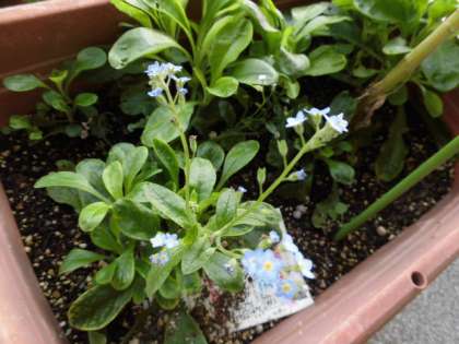 プランターのすみっこでは、ワスレナグサも、「私を忘れないでね」とささやいているかのように咲いています。
