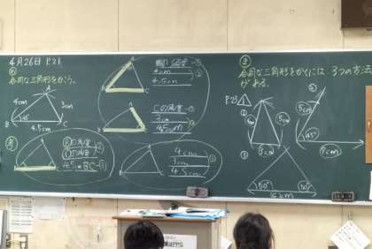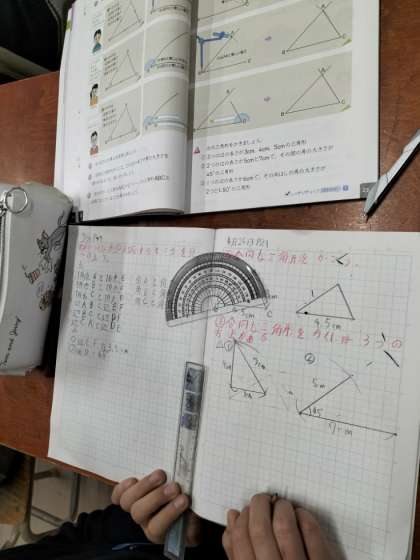 合同な三角形を描きます。定規や分度器、コンパスを使って描いています。コンパスを思い通りに使うことが難しかったですが、みんながんばって描いていました。