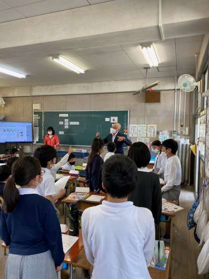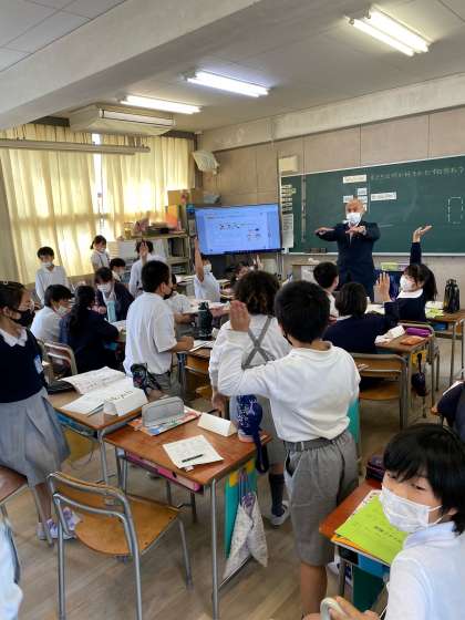 好きな色やスポーツ、食べ物について英語で尋ね合っています。