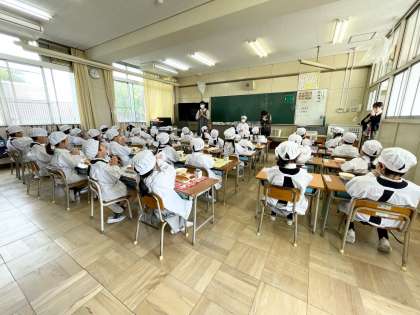 今日の献立は、黒糖パン・煮こみハンバーグ・コーンとキャベツのスープ・焼きかぼちゃ・牛乳です。