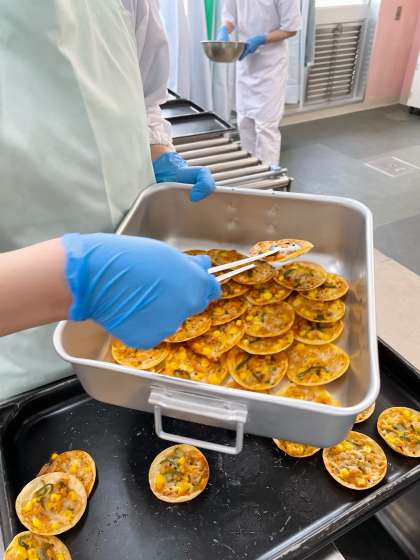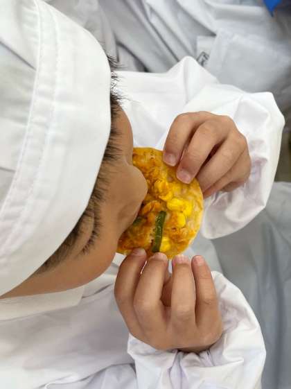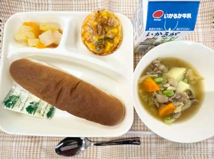 今日の献立は、コッペパン・ソフトマーガリン・豚肉と野菜のカレースープ煮・変わりピザ・ミックスフルーツかんづめ・牛乳です。