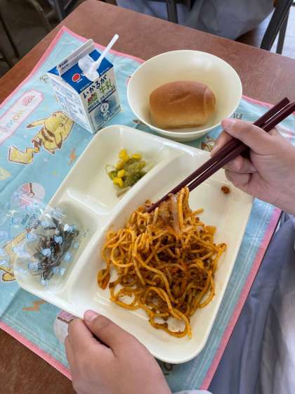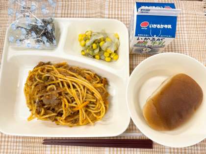 今日の献立は、1/2黒糖パン・ミートソーススパゲッティ・レタスとコーンのサラダ・ミニフィッシュ・牛乳です。