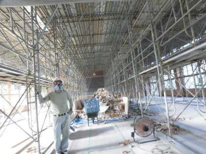 天井ボードがバリバリとはがされ、砕いたものが運び出されていきます。木くずやほこりがもうもうと立ち込め、視界がけむります。