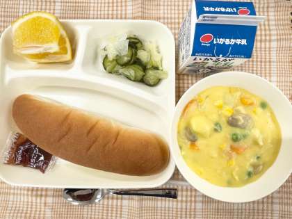 今日の献立は、コッペパン・いちごジャム・コーンクリームシチュー・キャベツときゅうりのサラダ・かわちばんかん・牛乳です。