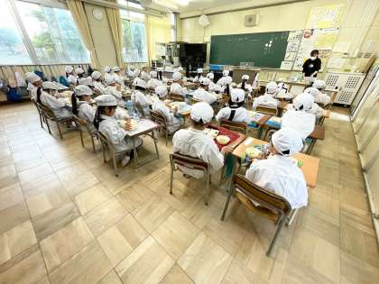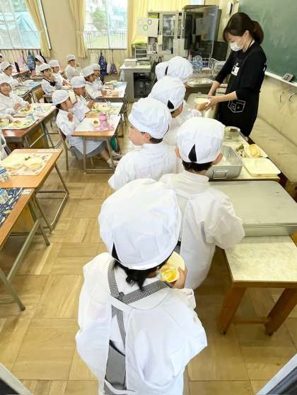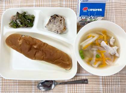 今日の献立は、おさつパン・かつおのマリネ焼き・スープ・グリーンアスパラガスのソテー・牛乳です。