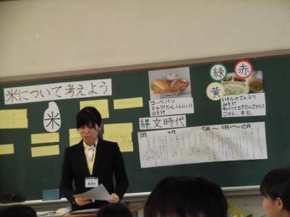 題材は、「米について考えよう」。日本の文化としてのお米について学び、米飯を中心とした食事が選択できるようになるよう考えました。