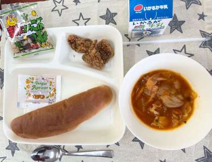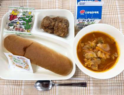 今日の献立は、コッペパン・アプリコットジャム・一口トンカツ・ミネストローネ・豆こんぶ・牛乳です。
