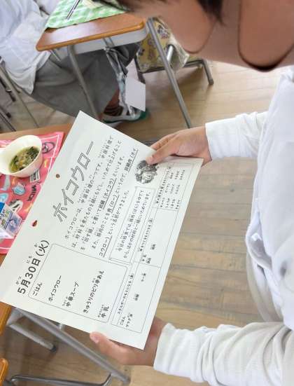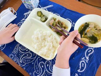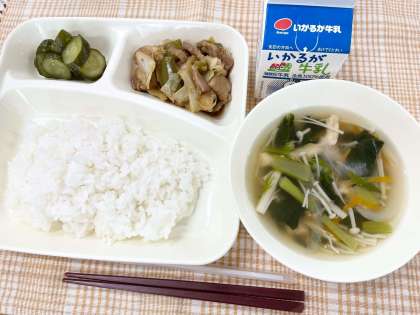 今日の献立は、ごはん・ホイコウロー・中華スープ・きゅうりのピリ辛あえ・牛乳です。