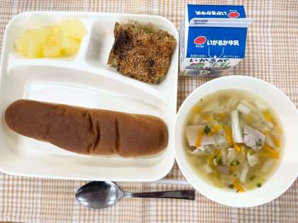 今日の献立は、黒糖パン・カレードリア・豚肉とキャベツのスープ・りんごのかんづめ・牛乳です。