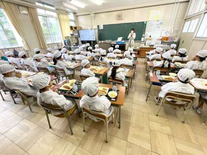 今日の給食を みんなで味わいます。