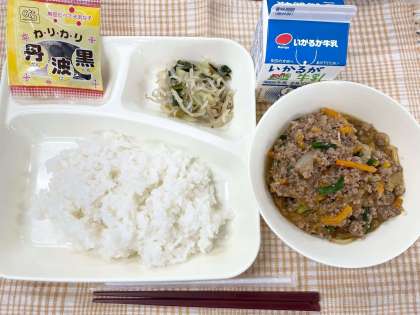 今日の献立は、ごはん・マーボーはるさめ・チンゲンサイともやしの甘酢あえ・いり黒豆・牛乳です。