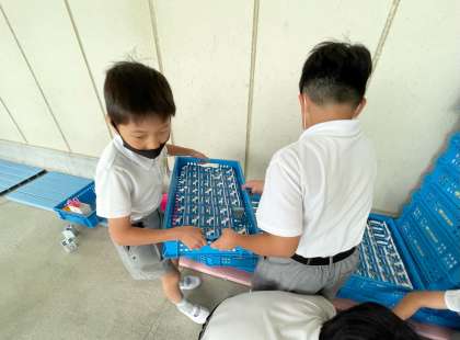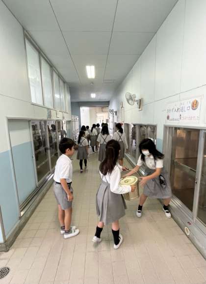 空っぽの食缶や 牛乳箱を受け取ると