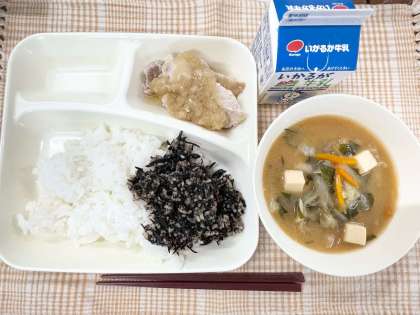今日の献立は、ごはん・鶏肉のおろしじょうゆかけ・みそ汁・魚ひじきそぼろ・牛乳です。