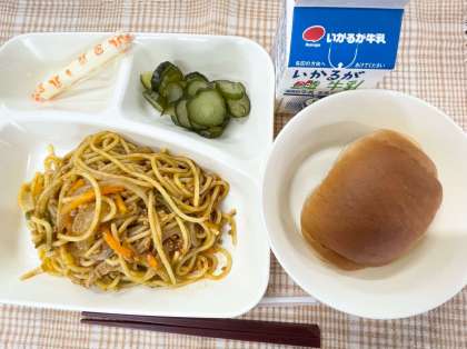 今日の献立は、1/2黒糖パン・カレースパゲッティ・きゅうりのピクルス・棒チーズ・牛乳です。