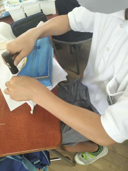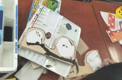 テープカッターを作成しています。あともう少しで完成です。思い思いに絵を描いています。それぞれのパーツをていねいに組み立てようとしていますが、なかなか苦心しています。