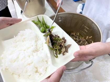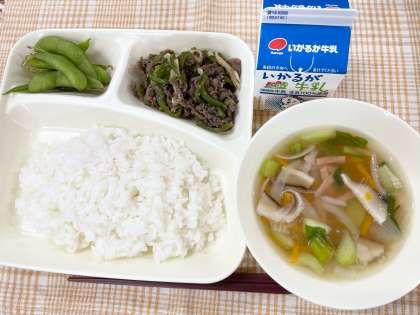 今日の献立は、ごはん・チンジャオニューロウスー・ハムと野菜の中華スープ・えだまめ・牛乳です。