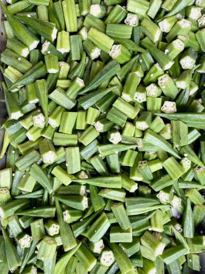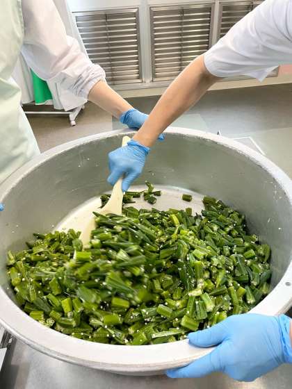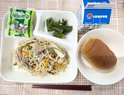 今日の献立は、1/2黒糖パン・和風焼きそば・オクラの甘酢あえ・まっ茶大豆・牛乳です。