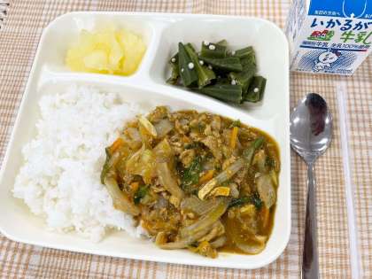 今日の献立は、和風カレー丼・オクラのかつお梅風味・りんごのかんづめ・牛乳です。