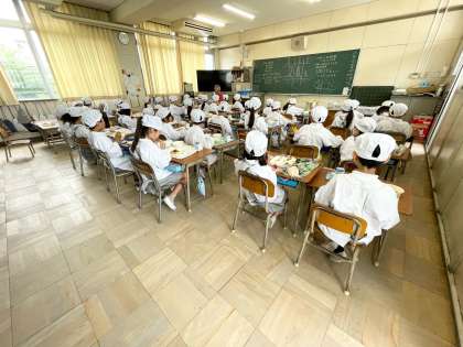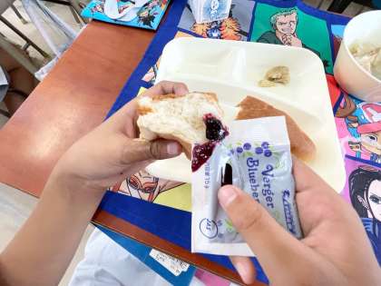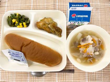 今日の献立は、コッペパン・ブルーベリージャム・鶏肉のカレー風味焼き・てぼ豆のスープ・三度豆とコーンのサラダ・牛乳です。