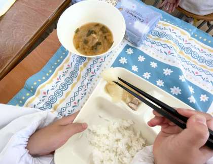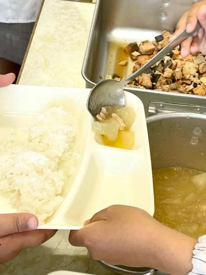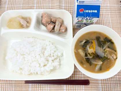 今日の献立は、ごはん・さけのつけ焼き・みそ汁・とうがんの煮もの・牛乳です。