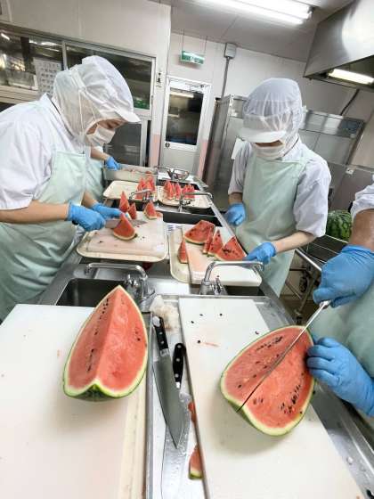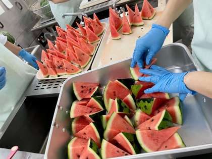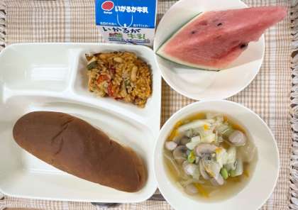 今日の献立は、黒糖パン・パエリア・ウインナーとキャベツのスープ・すいか・牛乳です。