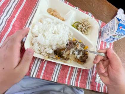 今日の献立は、牛丼・もやしとピーマンのごまいため・大福豆の煮もの・牛乳です。