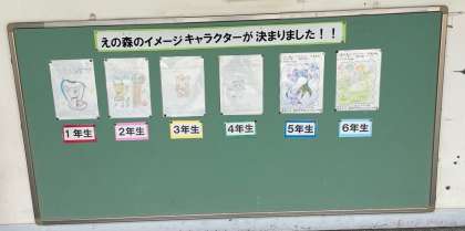 2代目「えのもりイメージキャラクター」を募集したところ、たくさんの応募がありました。各学年1つのイメージキャラクターが選ばれ、理科室前に掲示をしています。