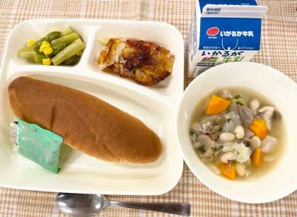 今日の献立は、コッペパン・りんごジャム・鶏肉とてぼ豆のスープ煮・じゃがいもとトマトのチーズ焼き・グリーンアスパラガスとコーンのサラダ・牛乳です。