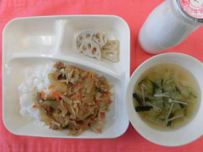 ピリ辛丼、中華スープ、れんこんのオイスターソース焼き、牛乳