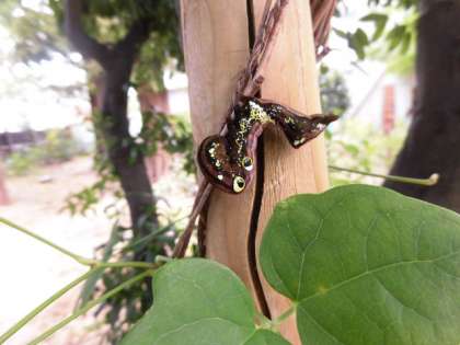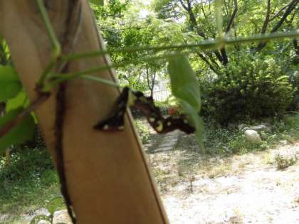 アケビのツルのところで、不思議な形のきれいなイモムシを見つけました。