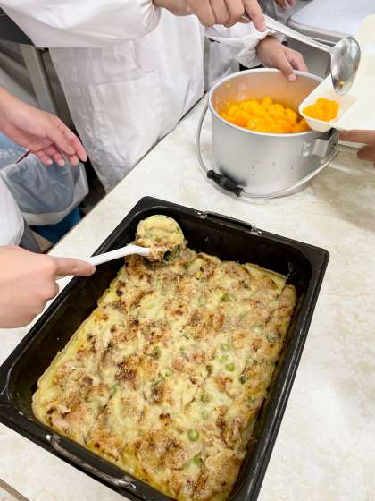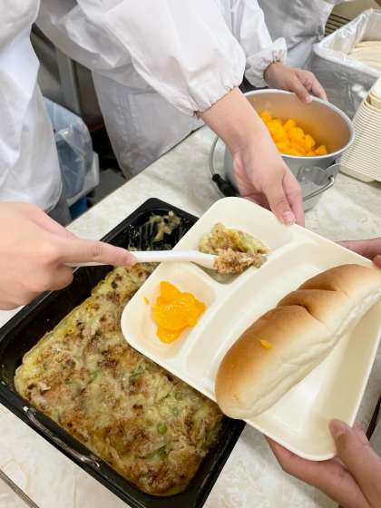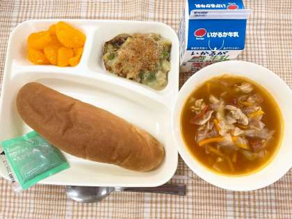今日の献立は、コッペパン・りんごジャム・豆乳マカロニグラタン(米粉)・トマトスープ・みかんの缶づめ・牛乳です。