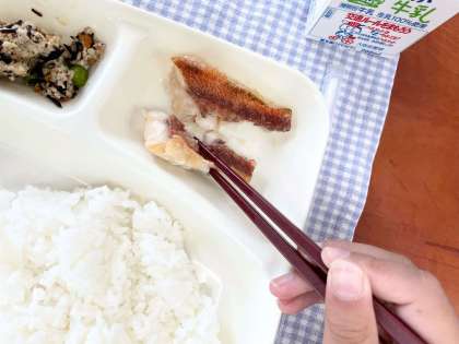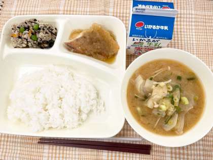 今日の献立は、ごはん・あかうおのおろしじょうゆかけ・みそ汁・高野どうふのいり煮・牛乳です。