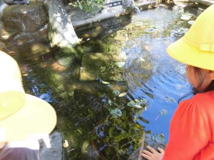 森のササでつくった船を、森の池に浮かべます。せせらぎがありますので、うまくいくとスイスイ進むのです。「浮かんだ!」「進んだ!」「ひっくりかえった〜!」と大喜び。とってもぜいたくな遊びだと思います。