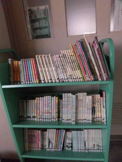 学校図書館の蔵書だけでは限りがありますので、公立図書館の協力も得て進めています。写真は、4年生の「ごんぎつね」の学習に向け、新美南吉作品を中心に、図書館からお借りした本です。ブックワゴンの上には、きちんと元に戻せるように、写真が貼ってあります。学習環境のUD(ユニバーサルデザイン)化のひとつです。