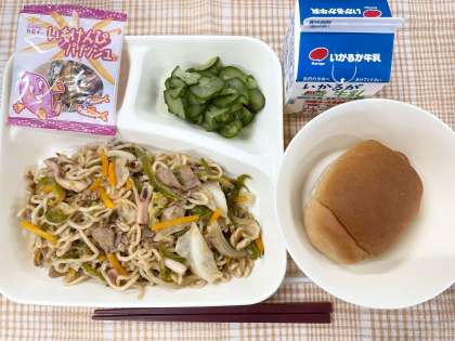 今日の献立は、1/2黒糖パン・焼きそば・きゅうりのしょうがづけ・いもけんぴフィッシュ・牛乳です。