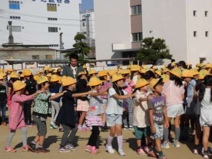 「あっちむいてホイ」で負けた人が、勝った人の後ろにつながっていきます。最後まで勝ち続けて先頭だった人たちには、みんなから拍手が贈られました。