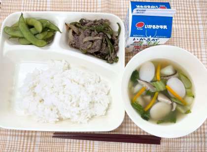 今日の献立は、ごはん・プルコギ・トック・えだまめ・牛乳です。